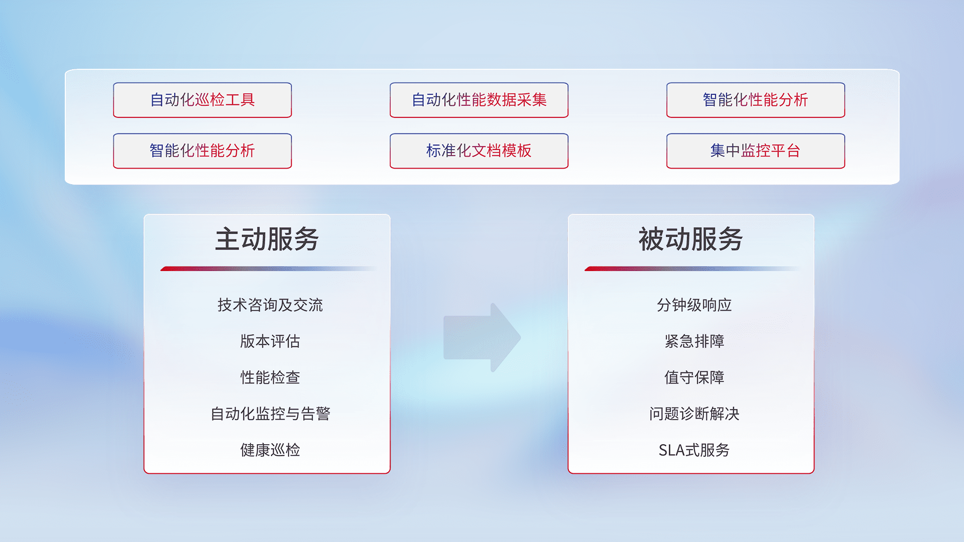 智能化工具和标准化文档,,,保障服务质量,,提供主动服务(包含技术咨询、、版本评估、、、、性能检查、、、、自动化监控与告警、、健康巡检)和被动服务包含(分钟级响应、、紧急排障、、、值守保障、、、、问题诊断解决、、SLA服务)。。。
