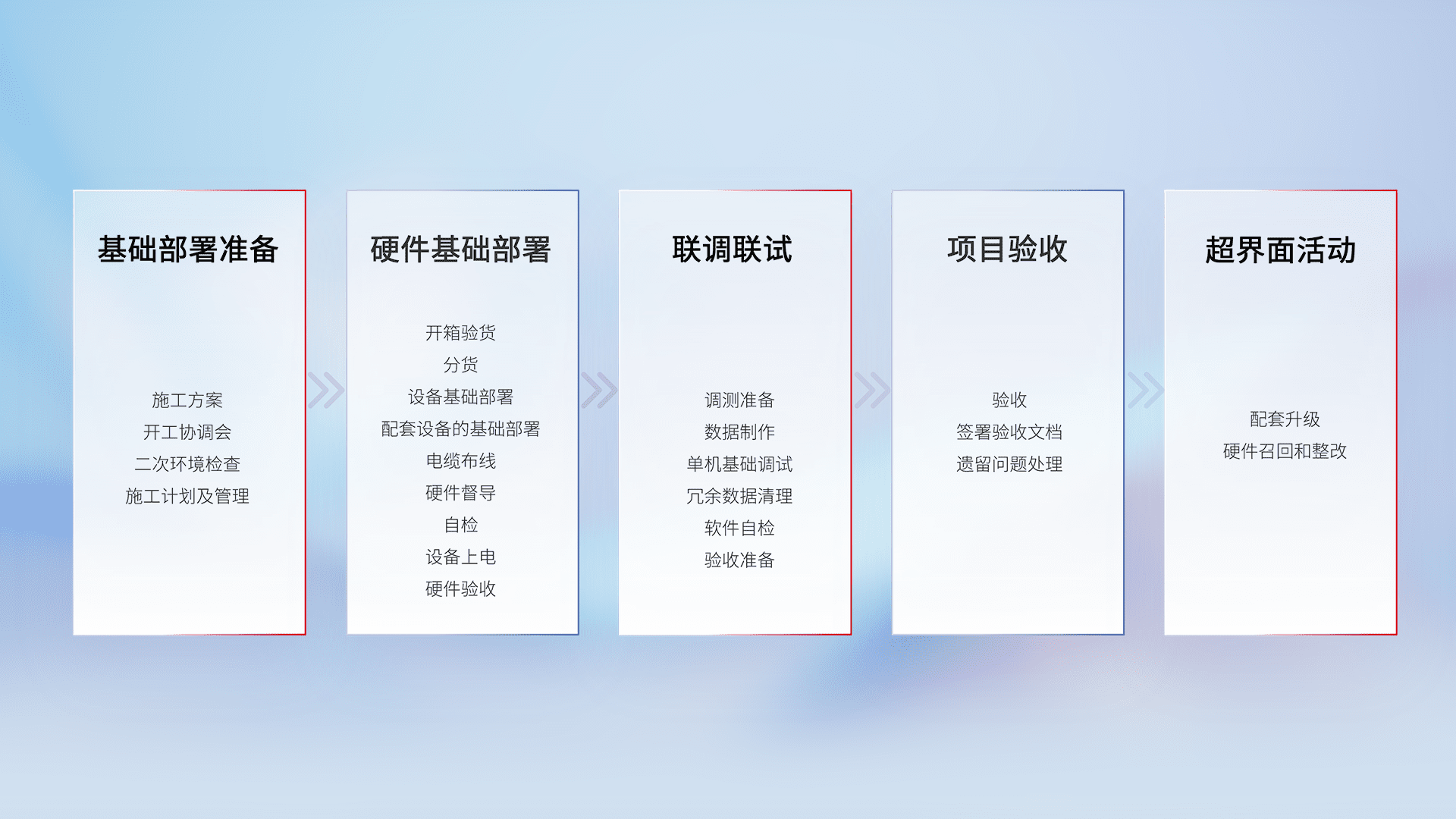 从基础部署准备、、硬件基础部署、、、、联调联试、、、项目验收、、越界面活动的全过程可追溯,,,,保证施工质量和进度。。。